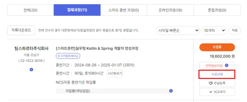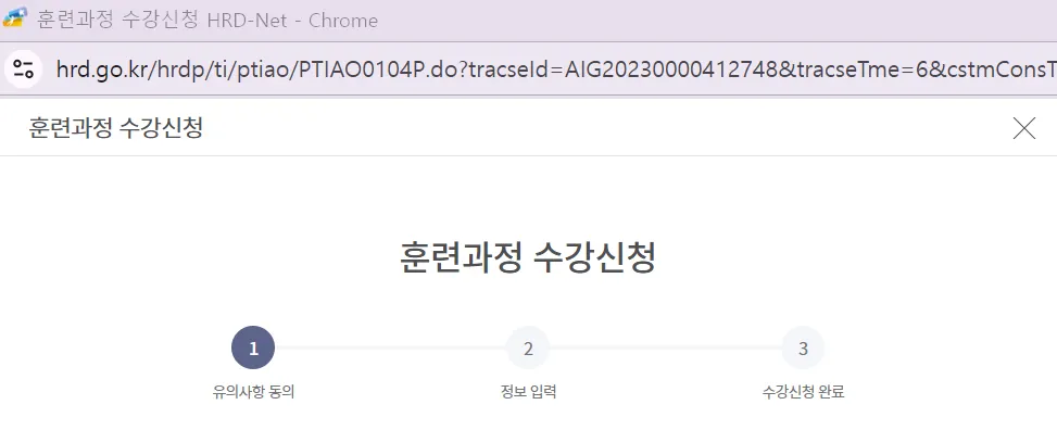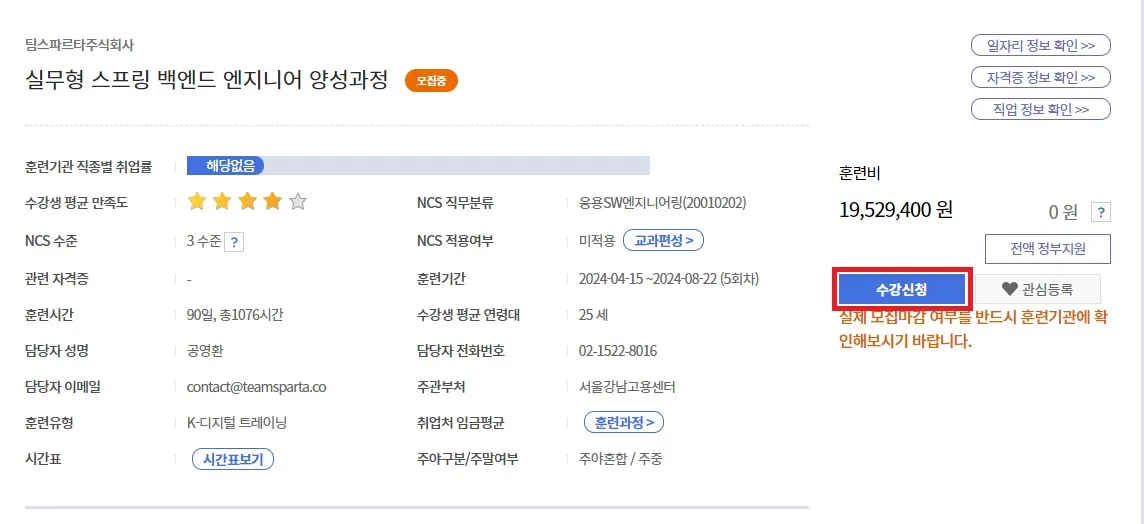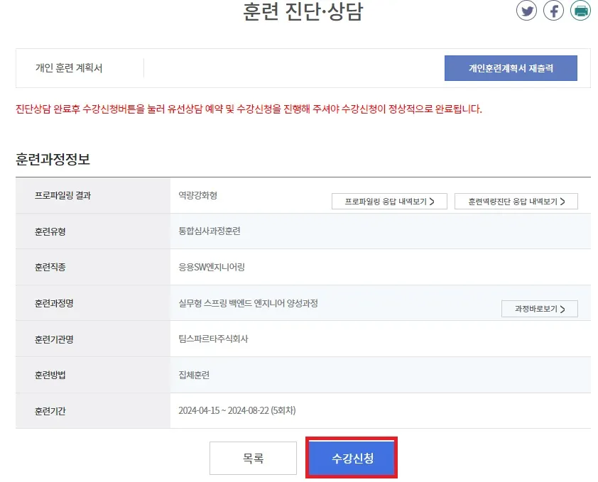 훈련과정 상세 페이지에서 [수강신청] 한번 더 클릭