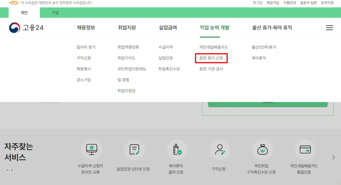 고용24 메뉴 상단의 [직업 능력 개발] > [훈련 찾기·신청] 클릭